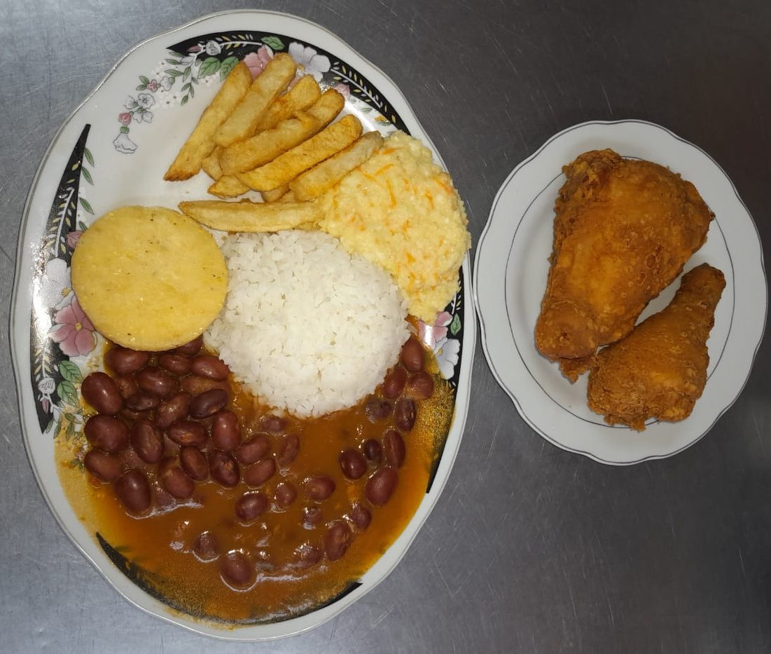 ACOMPAÑADO DE FRIJOLES + ARROZ + PAPAS A LA FRANCESA + ENSALADA DULCE + AREPA FRITA + PRESA APANADA