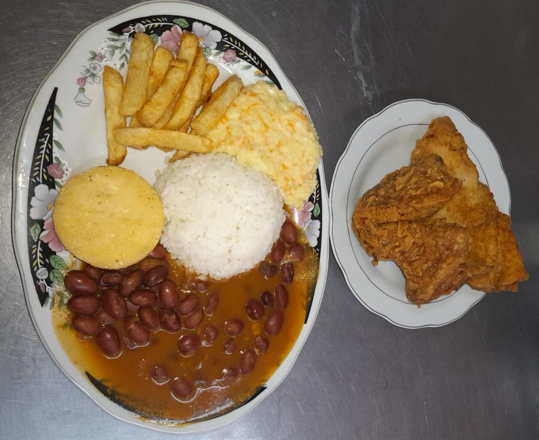 ACOMPAÑADO DE FRIJOLES + ARROZ + PAPAS A LA FRANCESA +